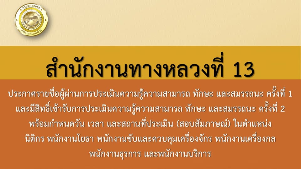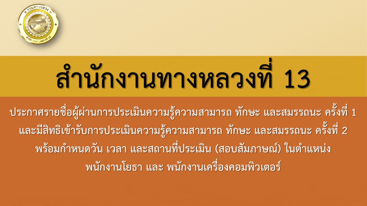 สำนักงานทางหลวงที่ 13 กรมทางหลวง ขอแจ้งประกาศรายชื่อผู้ผ่านการประเมินความรู้ความสามารถ ทักษะ และสมรรถนะ ครั้งที่ 1 และมีสิทธิเข้ารับการประเมินความรู้ความสามารถ ทักษะ และสมรรถนะ ครั้งที่ 2