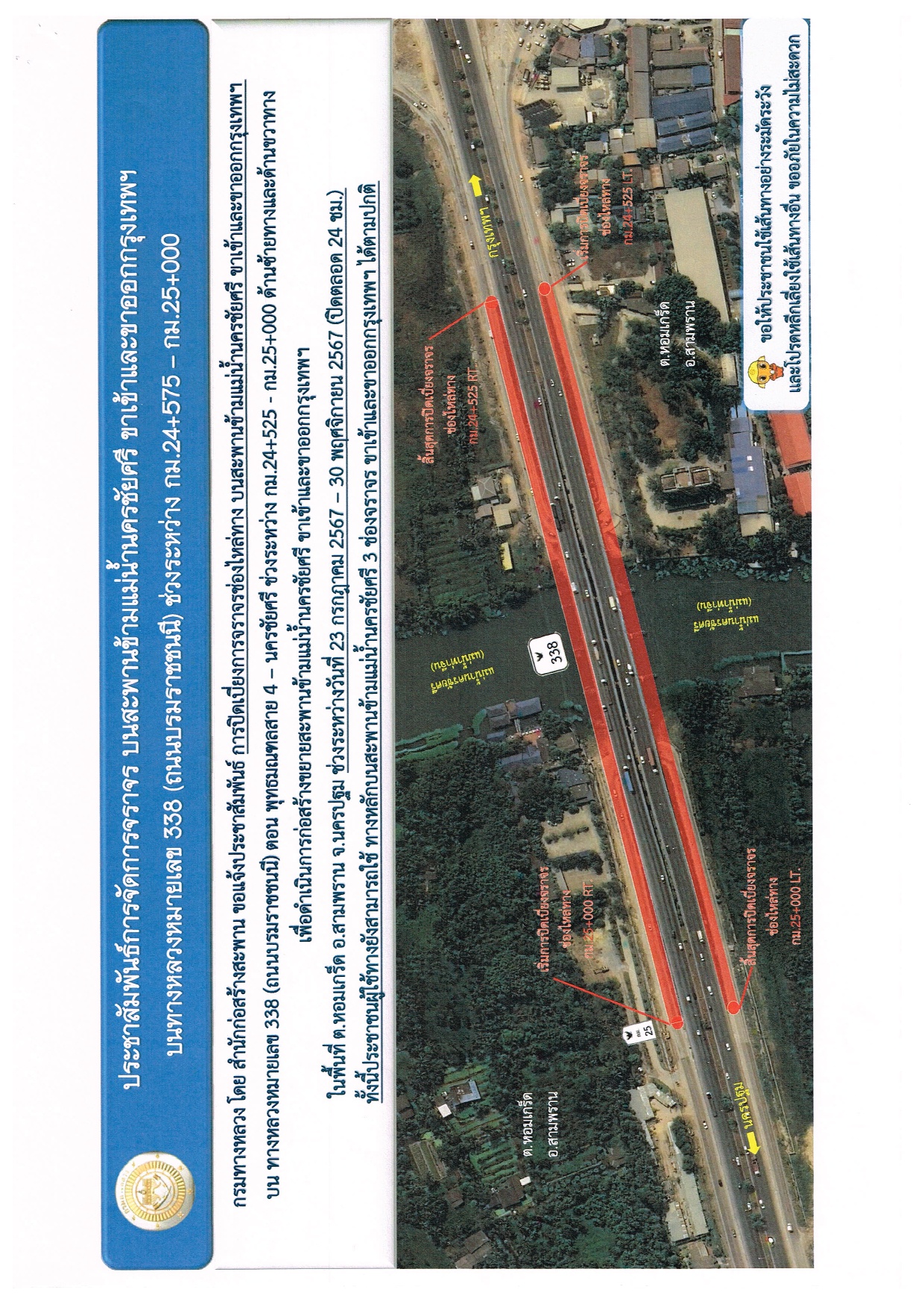 แจ้งประชาสัมพันธ์การจัดการจราจรบนสะพานข้ามแม่น้ำนครชัยศรี ขาเข้าและขาออกกรุงเทพฯ บนถนนทางหลวงหมายเลข 338 (ถนนบรมราชชนนี) ช่วงระหว่าง กม.24+525 - กม.25+000