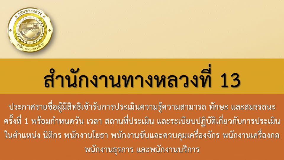 สำนักงานทางหลวงที่ 13 กรมทางหลวง ขอแจ้งประกาศรายชื่อผู้มีสิทธิเข้ารับการประเมินความรู้ความสามารถ ทักษะ และสมรรถนะ ครั้งที่ 1