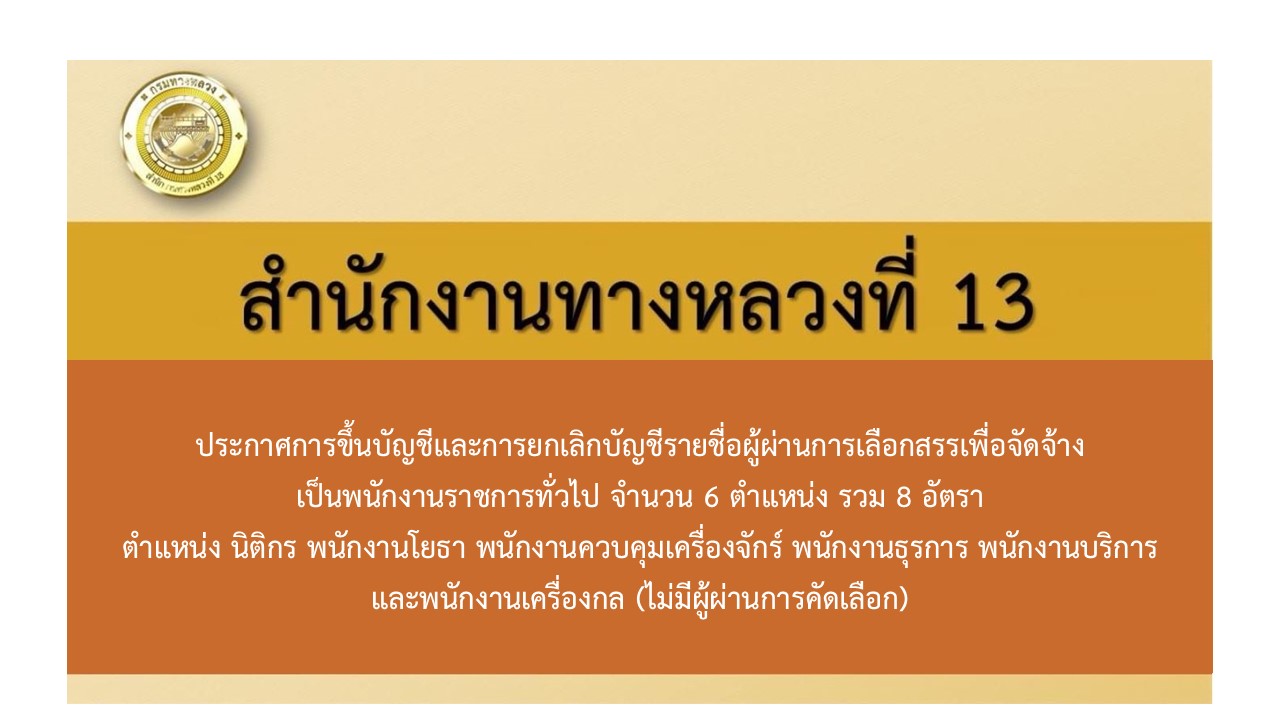 สำนักงานทางหลวงที่ 13 แจ้งประกาศการขึ้นบัญชีและการยกเลิกบัญชีรายชื่อผู้ผ่านการเลือกสรรเพื่อจัดจ้างเป็นพนักงานราชการทั่วไป