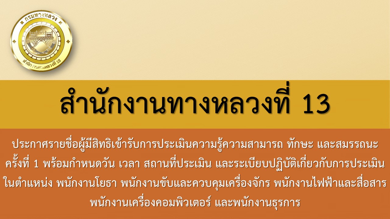 ประกาศรายชื่อผู้มีสิทธิเข้ารับการประเมินความรู้ความสามารถ ทักษะ และสมรรถนะ ครั้งที่ 1 พร้อมกำหนดวัน เวลา สถานที่ประเมิน และระเบียบปฏิบัติเกี่ยวกับการประเมิน ในตำแหน่ง พนักงานโยธา พนักงานขับและควบคุมเครื่องจักร พนักงานไฟฟ้าและสื่อสาร พนักงานเครื่องคอมพิวเตอร์ และพนักงานธุรการ