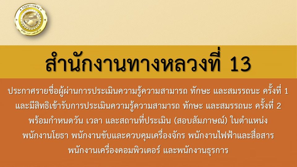ประกาศรายชื่อผู้มีสิทธิเข้ารับการประเมินความรู้ความสามารถ ทักษะ และสมรรถนะ ครั้งที่ 2 พร้อมกำหนดวัน เวลา และสถานที่ประเมิน (สอบสัมภาษณ์) ในตำแหน่ง พนักงานโยธา พนักงานขับและควบคุมเครื่องจักร พนักงานไฟฟ้าและสื่อสาร พนักงานเครื่องคอมพิวเตอร์ และพนักงานธุรการ