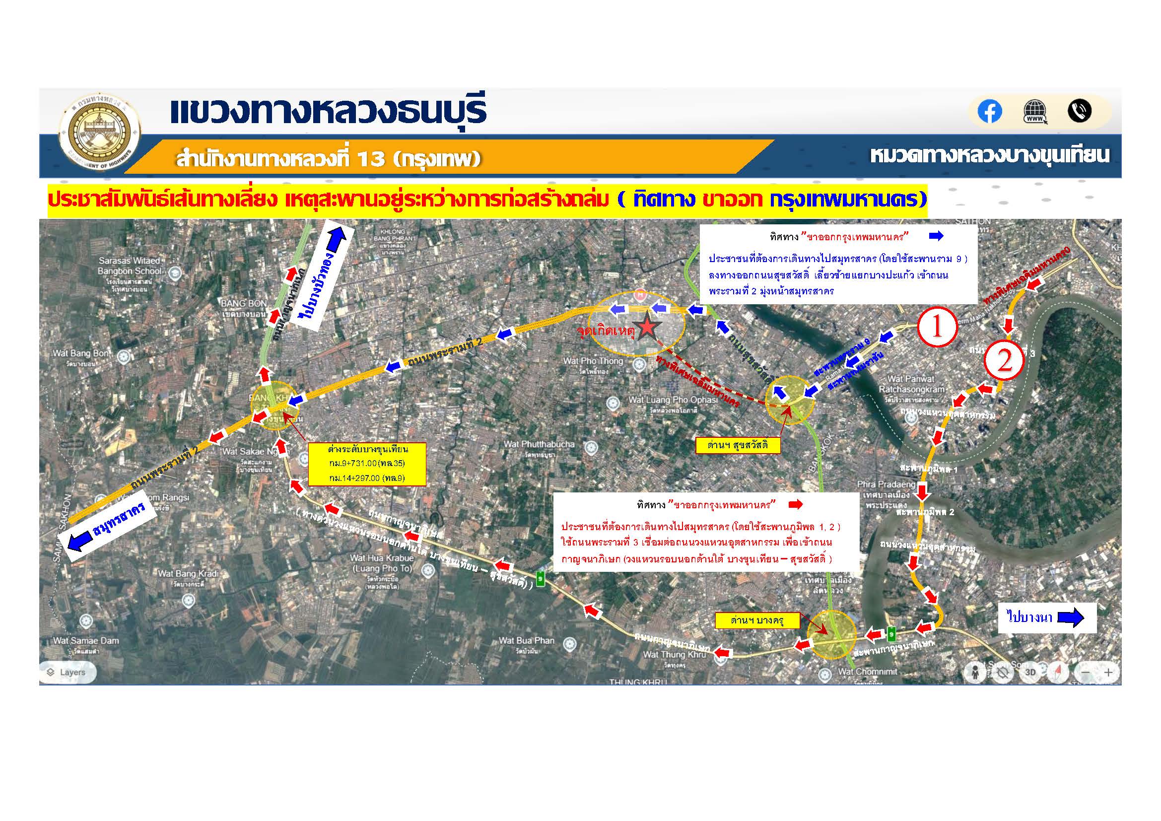 กรมทางหลวง โดย แขวงทางหลวงธนบุรี แจ้งประชาสัมพันธ์เส้นทางเลี่ยง เหตุโครงสร้างที่อยู่ระหว่างการก่อสร้างเกิดการทรุดตัว บริเวณหน้าด่านฯดาวคะนอง พื้นที่การก่อสร้างโครงการทางพิเศษสายพระราม 3 - ดาวคะนอง - วงแหวนรอบนอกกรุงเทพมหานครด้านตะวันตก สัญญาที่ 3