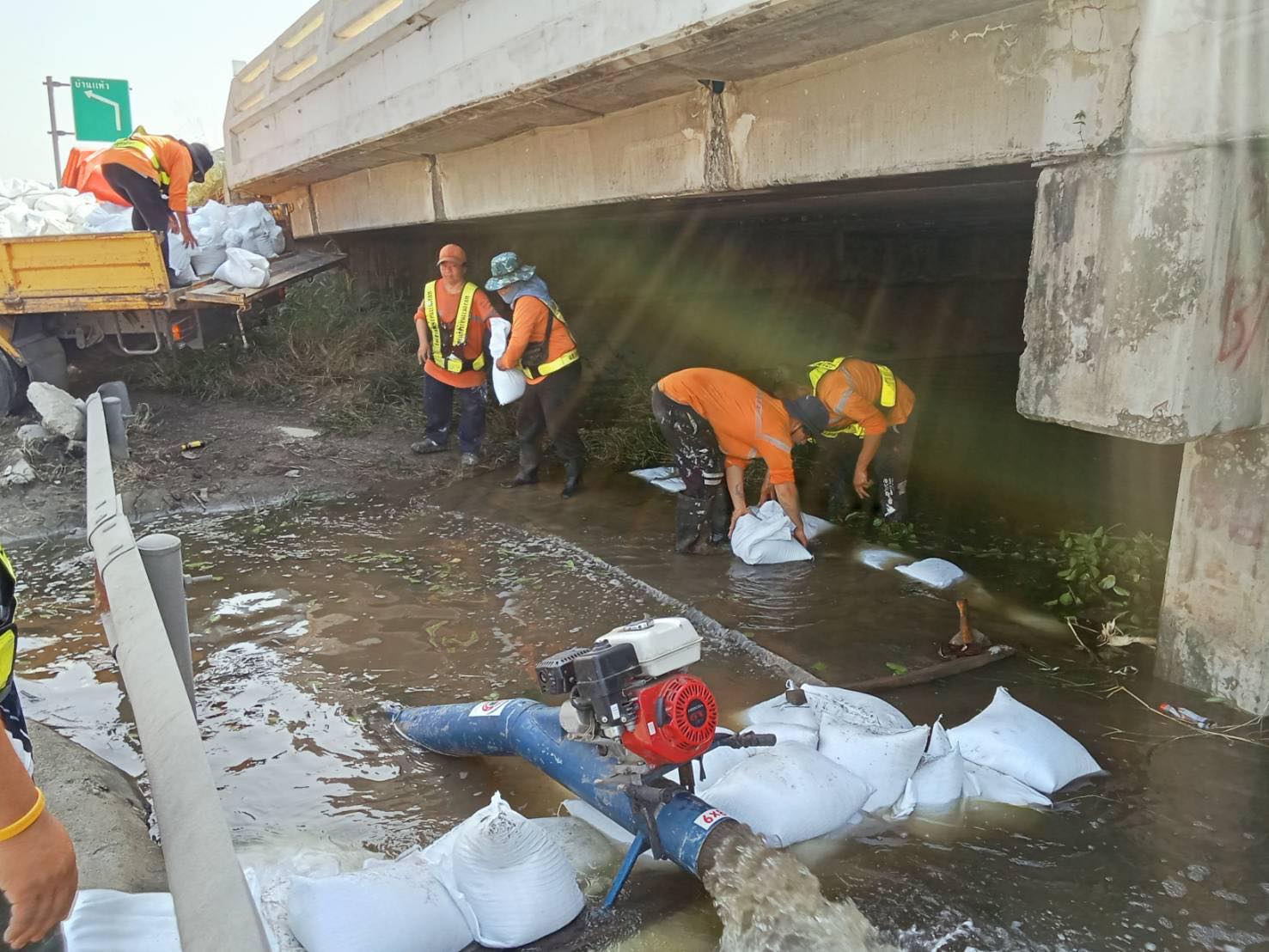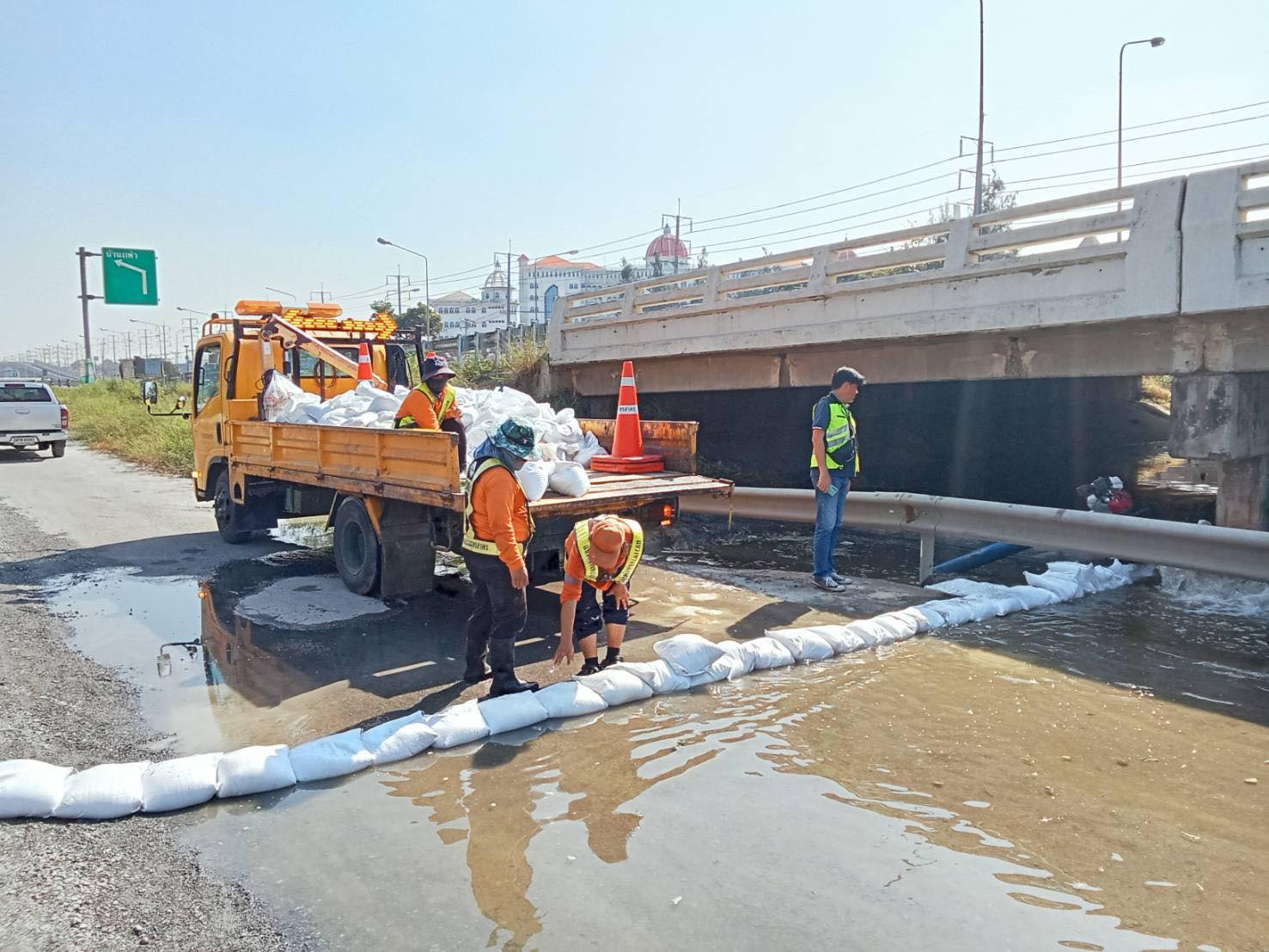 เจ้าหน้าที่กรมทางหลวง โดยแขวงทางหลวงสมุทรสาคร ติดตั้งป้าย เร่งดำเนินการวางกระสอบทรายทำเป็นคันกั้นน้ำ และติดตั้งเครื่องสูบน้ำ เพื่อดึงน้ำออกจากผิวจราจรอย่างเต็มที่