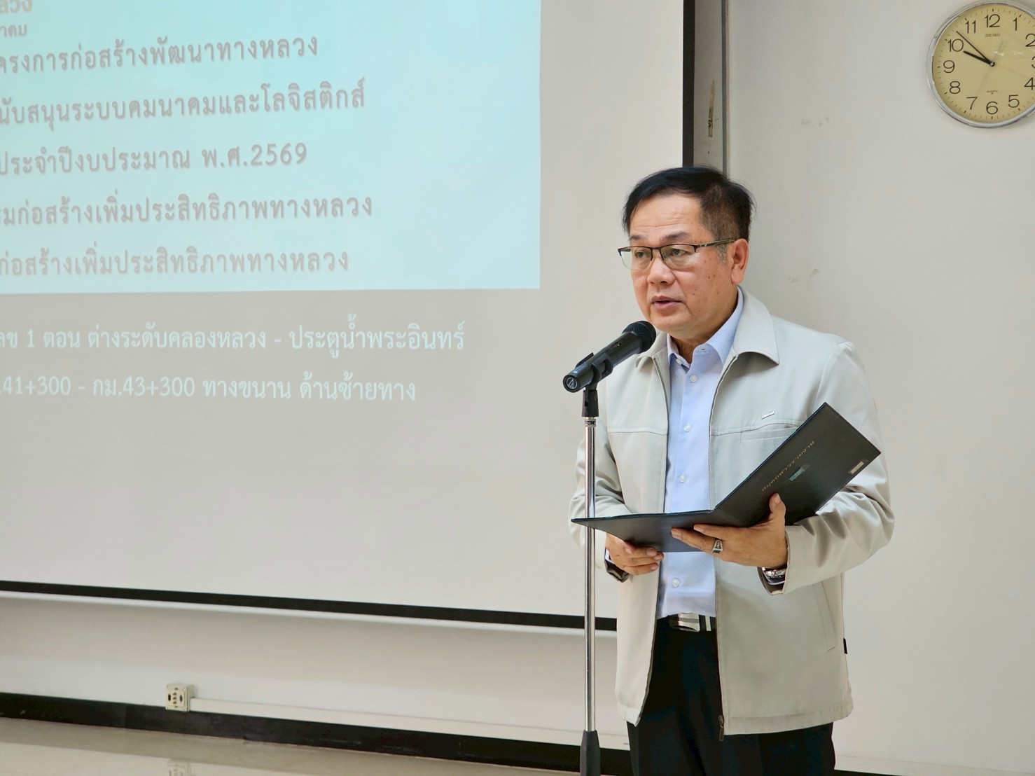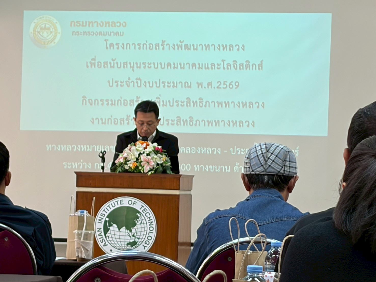 แขวงทางหลวงปทุมธานีดำเนินการจัดการประชุมการมีส่วนร่วมของประชาชนในวันศุกร์ที่ 9 มกราคม 2569 เวลา 9.00น. - 12.00 น. ณ ศูนย์ประชุมสถาบันเทคโนโลยีแห่งเอเชีย AIT ห้อง B108 ชั้น 1 อาคารศูนย์ประชุมสถาบันเทคโนโลยีแห่งเอเชีย AIT (AIT CONFERNCE CENTER & HOTEL) ถนนพหลโยธิน ตำบลคลองหนึ่ง อำเภอคลองหลวง จังหวัดปทุมธานี โดยมี นายองครักษ์ ทองนิรมล รองผู้ว่าราชการจังหวัดปทุมธานี เป็นประธานเปิดการประชุม