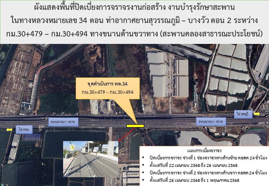 งานก่อสร้างกิจกรรมบำรุงรักษาสะพาน งานบำรุงรักษาสะพาน ทางหลวงหมายเลข 34 ตอน ทางเข้าท่าอากาศยานสุวรรณภูมิ - บางวัว ระหว่าง กม.30+479 - กม.30+494 ทางขนานด้านขวาทาง