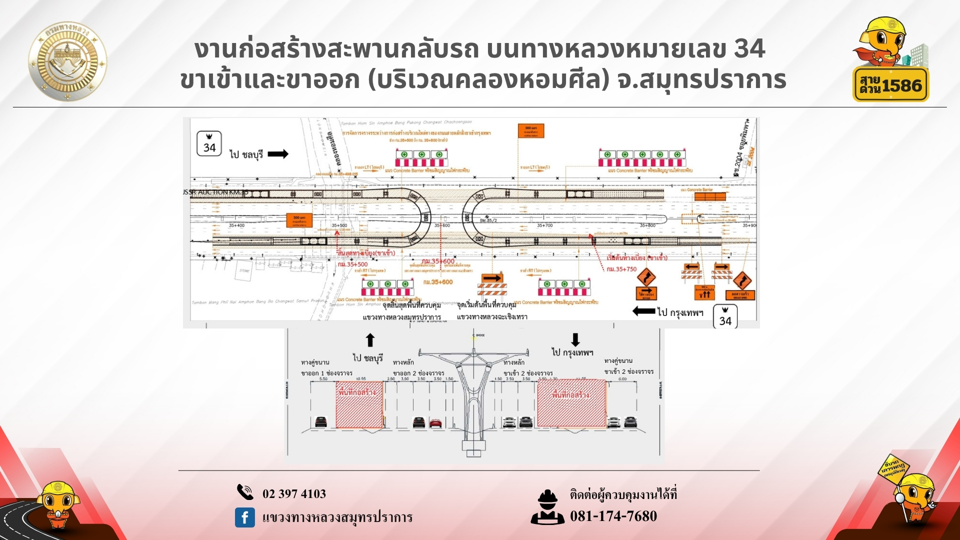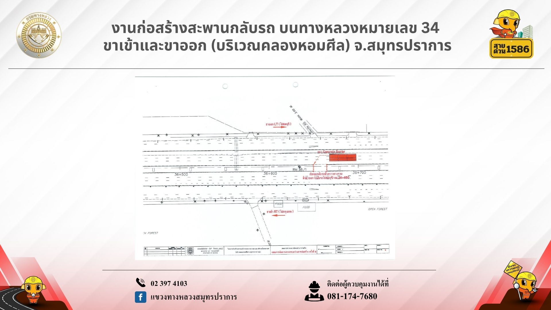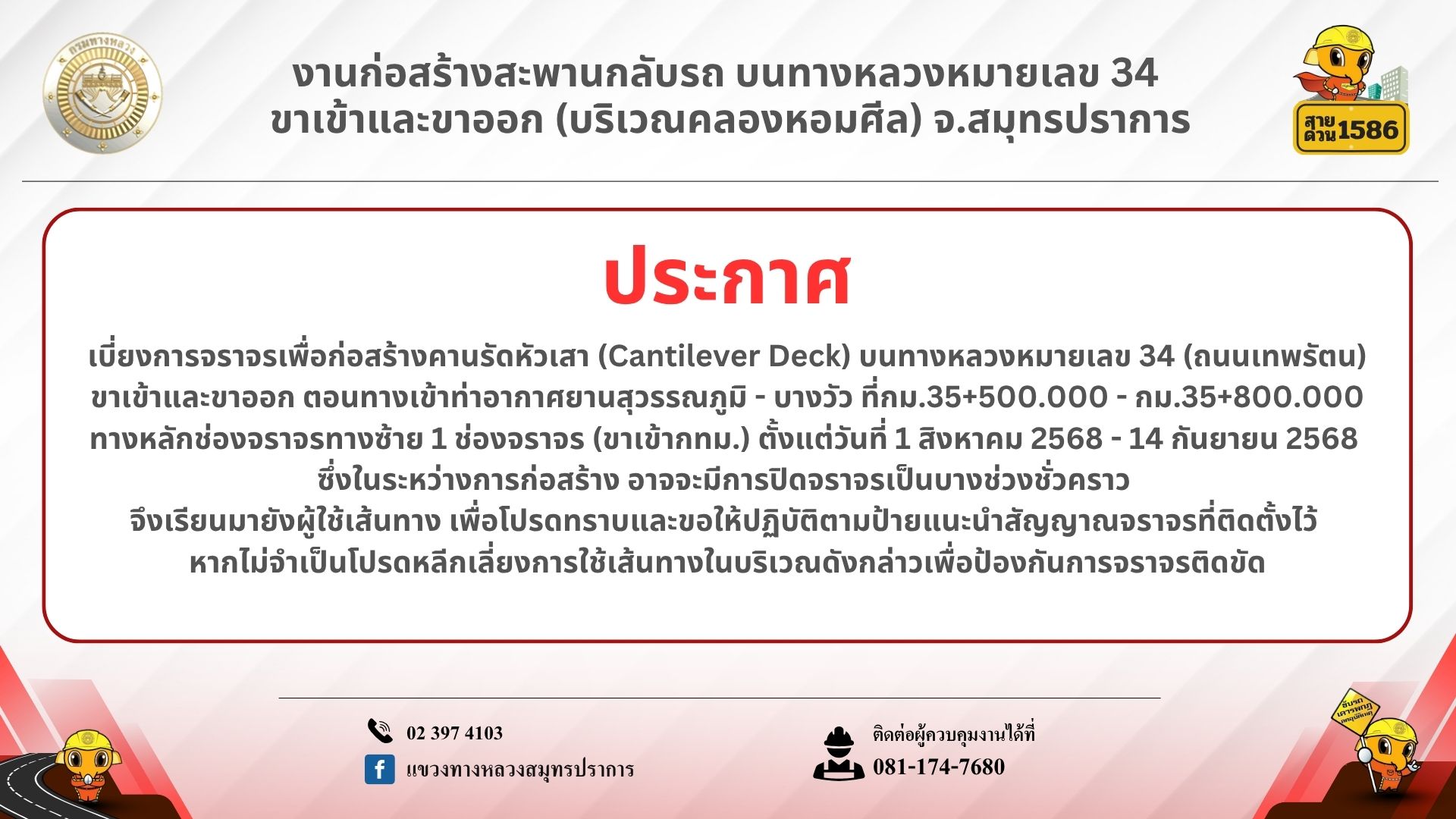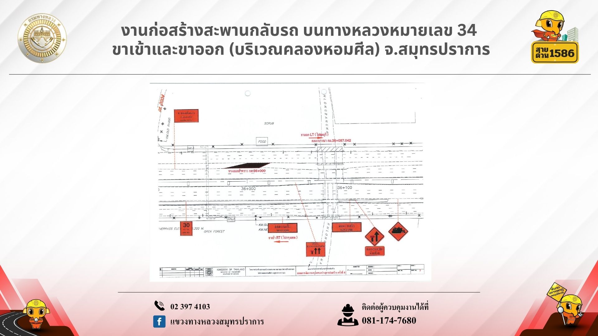 สอบถามข้อมูลเพิ่มเติม ผู้ควบคุมงาน: 081-174-7680, แขวงทางหลวงสมุทรปราการ: 02-397-4103, สายด่วนกรมทางหลวง 1586 (โทรฟรีทุกเครือข่าย)