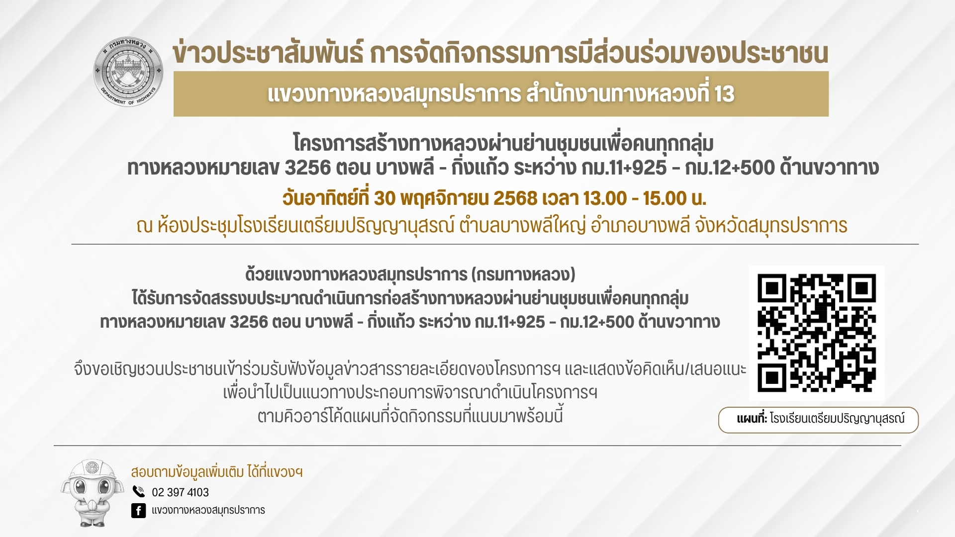 แขวงทางหลวงสมุทรปราการ (กรมทางหลวง) ขอเชิญประชาชนเข้าร่วม กิจกรรมการมีส่วนร่วมของประชาชน ตามที่ได้รับการจัดสรรงบประมาณดำเนินการก่อสร้างก่อสร้างทางหลวงผ่านย่านชุมชนเพื่อคนทุกกลุ่ม