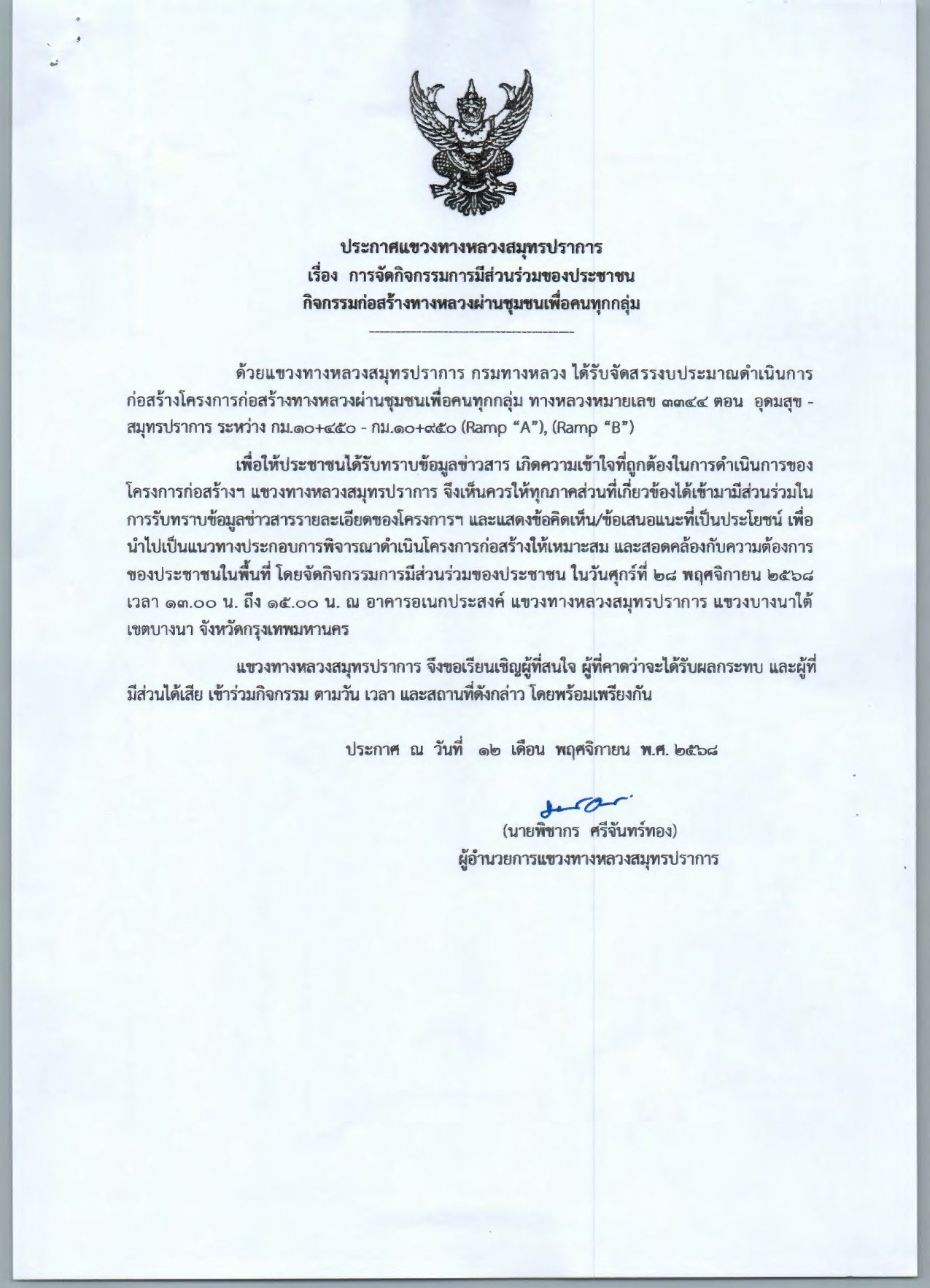 เชิญร่วมแสดงความคิดเห็น!!! ขอเชิญประชาชนเข้าร่วม กิจกรรมการมีส่วนร่วมของประชาชนด้วยแขวงทางหลวงสมุทรปราการ (กรมทางหลวง) ได้รับการจัดสรรงบประมาณดำเนินการก่อสร้างโครงการก่อสร้างทางหลวงผ่านย่านชุมชนเพื่อคนทุกกลุ่ม ทางหลวงหมายเลข 3344 (ถนนศรีนครินทร์) ตอน อุดมสุข - สมุทรปราการ ระหว่าง กม.10+450 - กม.10+590 (Ramp A,B)