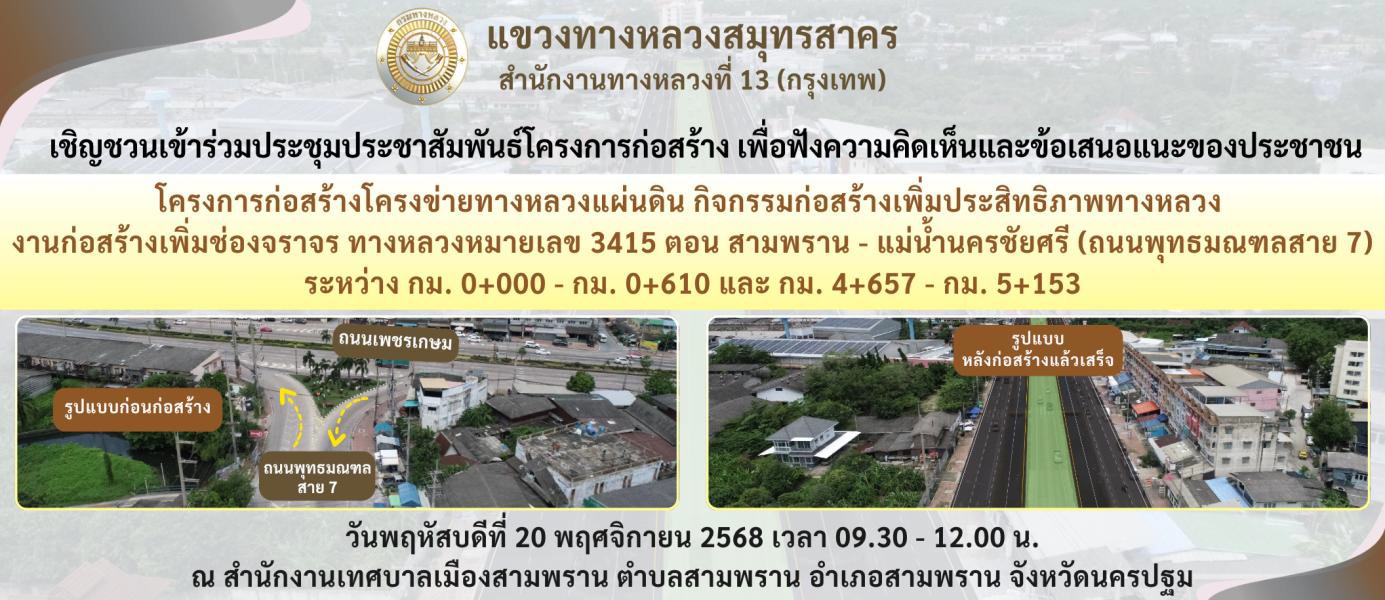 | 2. โครงการก่อสร้างโครงข่ายทางหลวงแผ่นดิน กิจกรรมก่อสร้างเพิ่มประสิทธิภาพทางหลวง (งานก่อสร้างเพิ่มช่องจราจร) ทางหลวงหมายเลข 3415 ตอน สามพราน - แม่น้ำนครชัยศรี ระหว่าง กม. 0+000 - กม. 0+610 และ กม. 4+657 - กม. 5+153 ระยะทางยาวประมาณ 1.106 กิโลเมตร | 6 | ดาวน์โหลด |